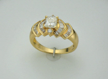 Item: 8034 Description 18KT yellow gold 1 princess diamond approx .55ct approx G/H color I1/I2 clarity. Thirty baguette diamonds and two round full cut diamonds approx 1.55cttw, average H/I avg SI