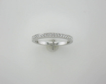 14kt white gold and diamond wedding ring micro pave set with round full cut diamonds with a total diamond weight of .15ct. Filigree motif on sides.