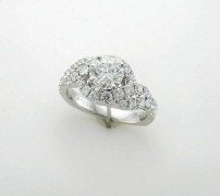 Platinum and diamond ring set with one .92ct. round brilliant cut diamond H in color and I1 in clarity (GIA cert). There are also ninety two round brilliant cut diamonds with a total diamond weight of .75cts. Larger diamond in center in four prongs and smaller diamonds micro pave set.