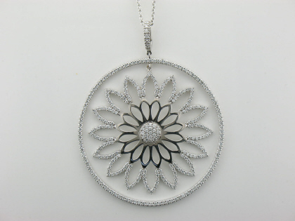 18kt white gold and diamond medallion pendant 2.25 inches in diameter pave set with small round brilliant cut diamonds with a total diamond weight of 3.63cts. The pendant is an open flower motif with a hinged enhancer bail. Eighteen inch cable link chain with a lobster clasp.